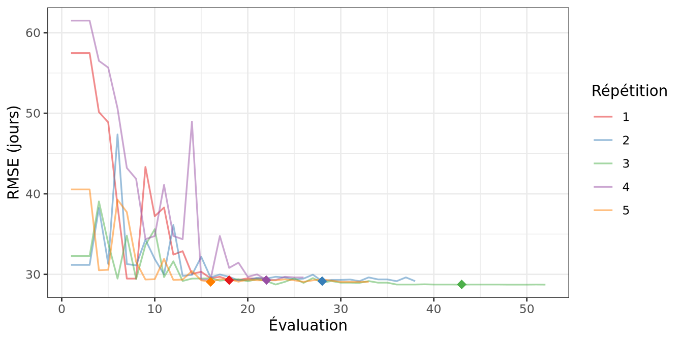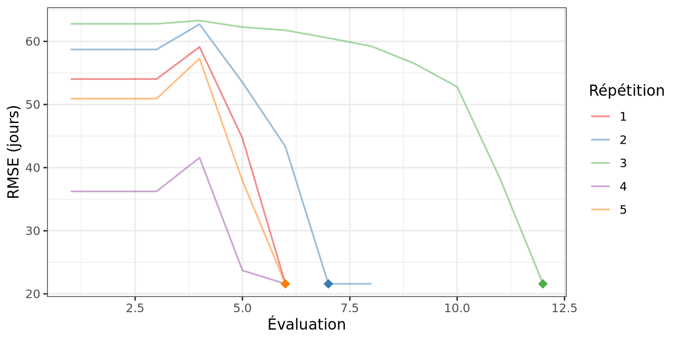 Figure 4.2: Évolution du critère RMSE (jours) au cours des évaluations du modèle — étape 1 (iamfs). Chaque couleur correspond à une répétition du Simplex. Le point indique la meilleure solution retenue.