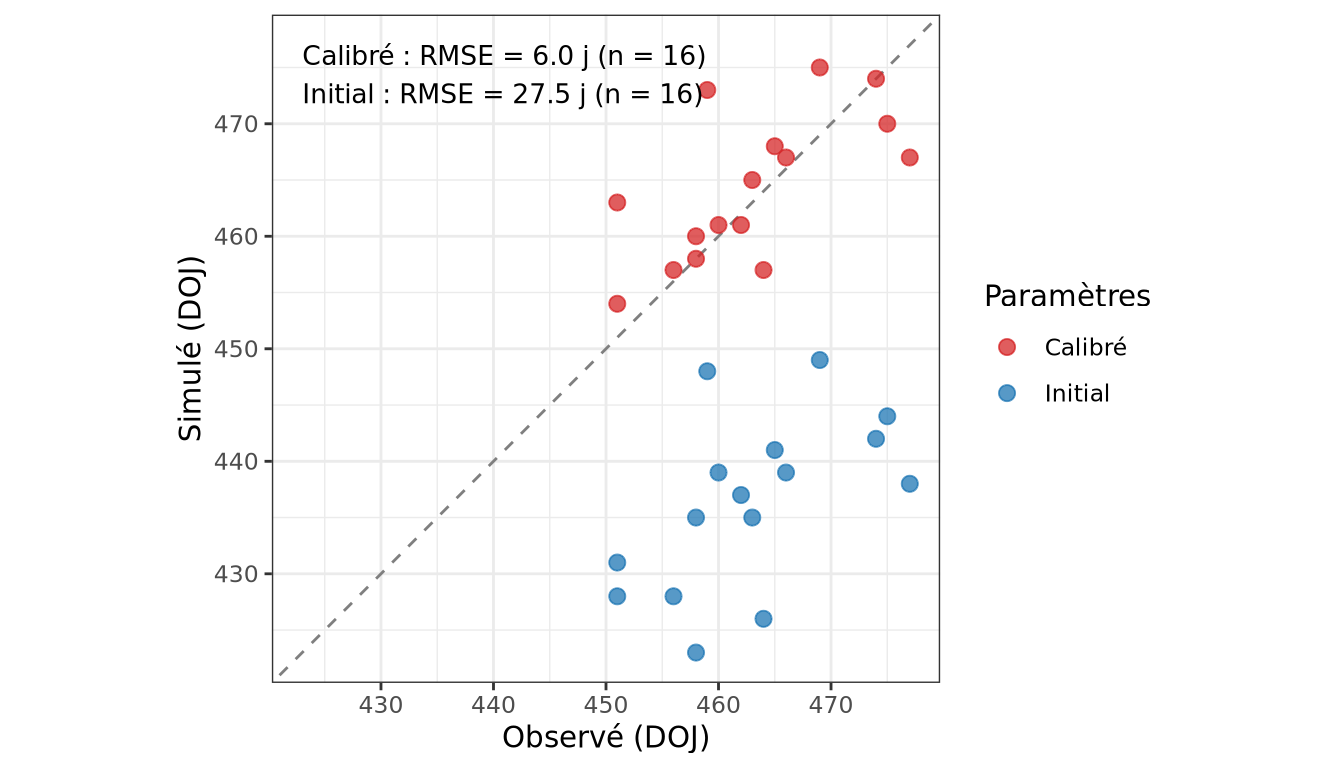 Figure 4.1: Comparaison entre observations et simulations pour l’étape 1 (iamfs). Bleu : paramètres initiaux. Rouge : paramètres calibrés. La droite en tiretés est la bissectrice (simulation parfaite).
