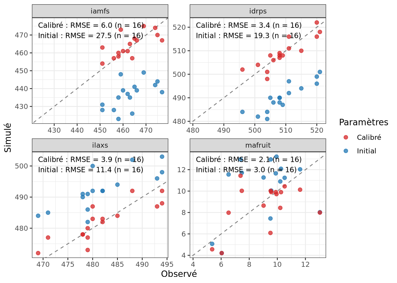 Le diagnostic est produit par le script scripts/05_plot_calib_diag.R à partir des résultats de toutes les étapes complétées. Il compare, pour chaque variable calibrée, les valeurs observées aux valeurs simulées avant et après optimisation des paramètres de l’étape concernée.