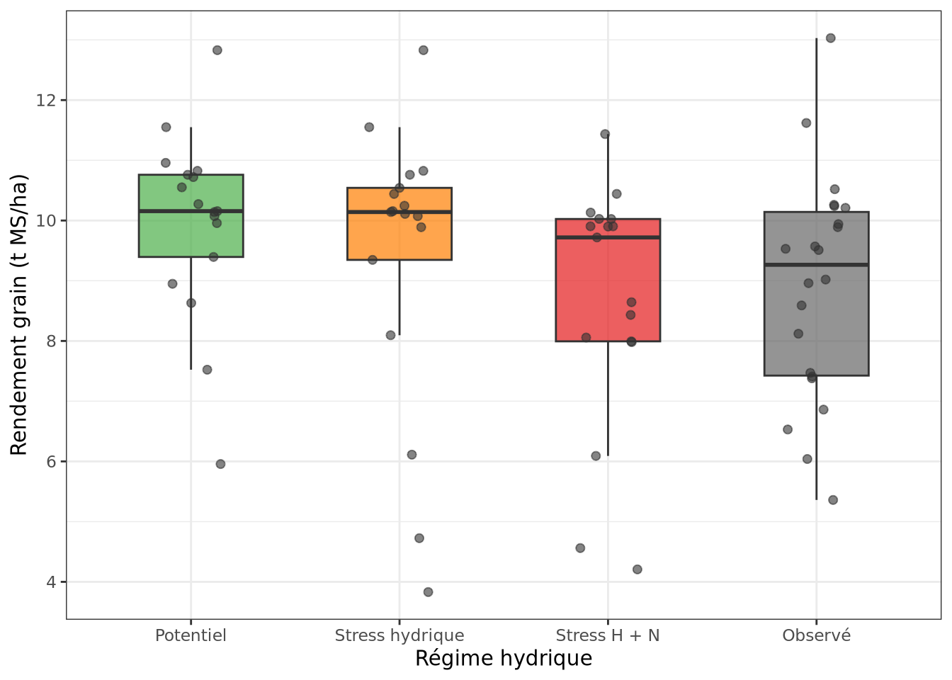 Absence de séparation entre Potentiel et Stress hydrique. C’est (trop) curieux. Les deux distributions sont quasi-identiques (~10 t MS/ha), ce qui suggère que le stress hydrique joue un rôle mineur sur ce site. On peut raisonnablement en douter, même si ce résultat traduit aussi un contexte pédoclimatique de Clermont-Ferrand — sol limoneux à bonne réserve utile. Mais pas de cet ordre de grandeur.