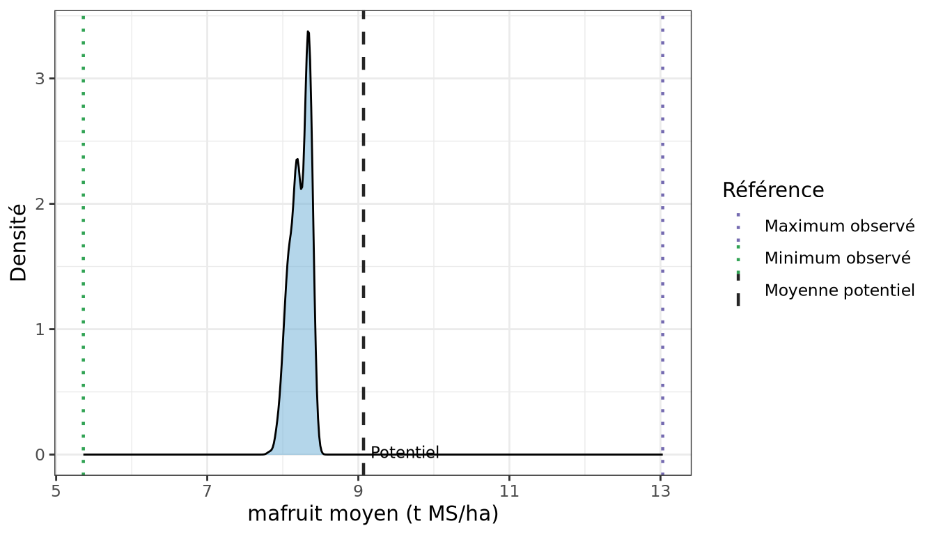 mafruit) pour le LHS hydrique (W_stress), comparée au potentiel et à l’étendue des observations.