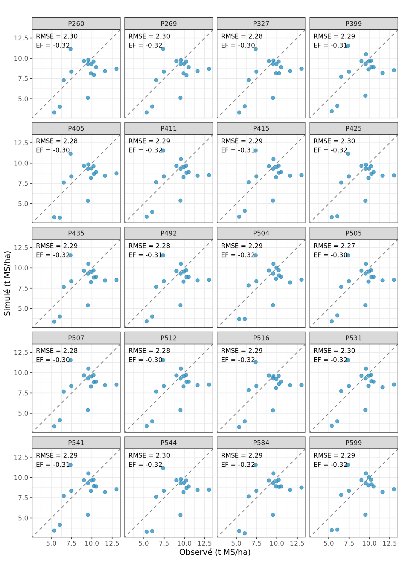 EF = 1 : simulation parfaiteEF = 0 : le modèle fait aussi bien que la moyenne des observationsEF < 0 : le modèle fait moins bien que cette moyennePlus EF est élevé, meilleure est la qualité prédictive du modèle sur les observations considérées.
